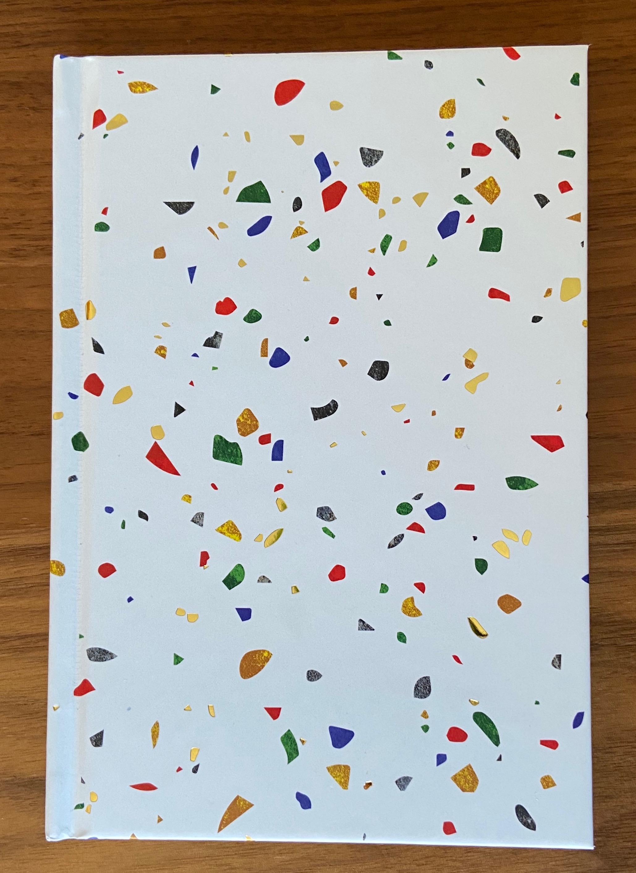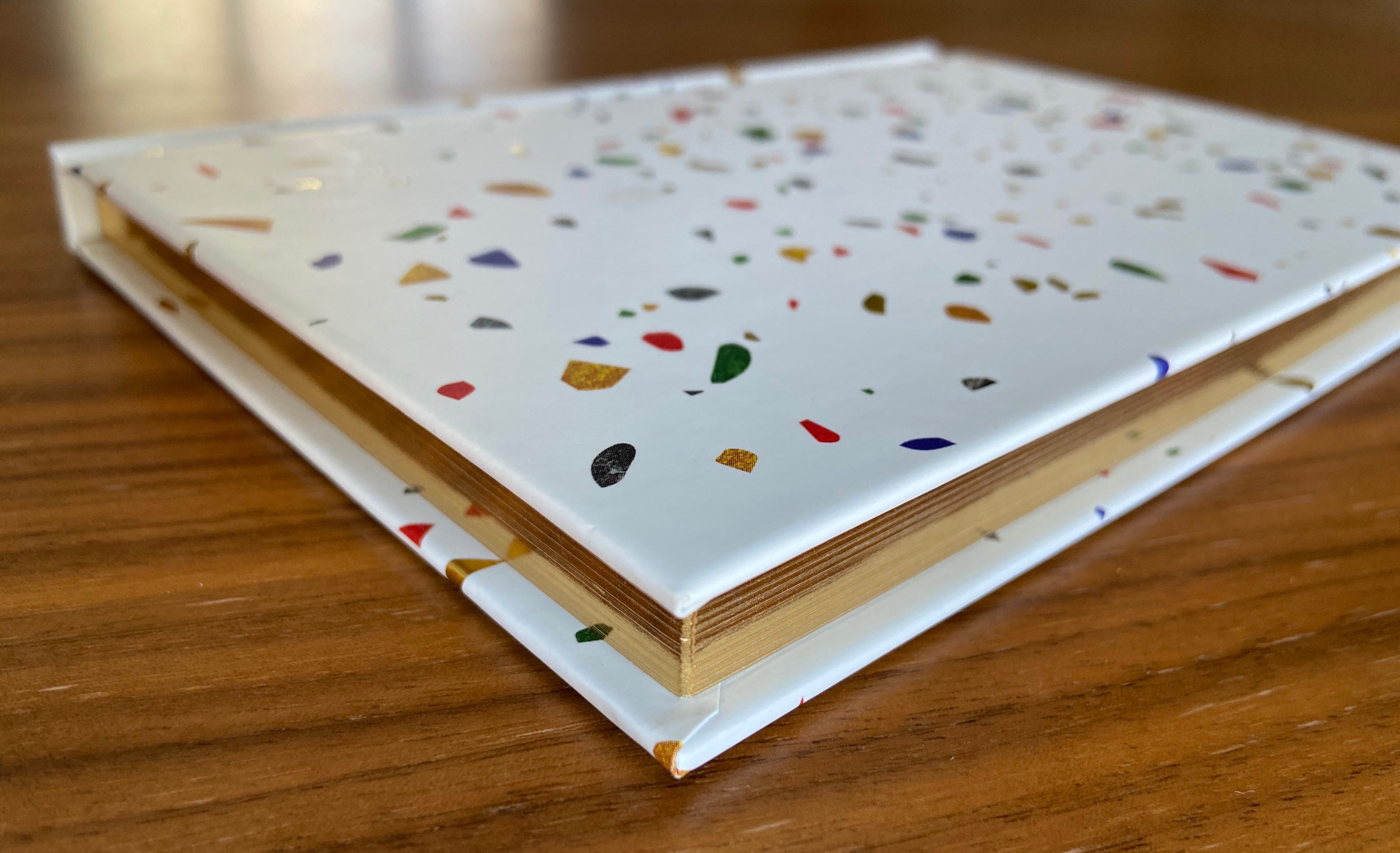 In terms of this particular notebook, I was drawn to the gold edged pages at first. Normally I avoid white, but the starkness of it with the brightly colored confetti was perfectly done. The confetti colors, too, are not at all excessive or overdone, maintaining a specific palette without being dull about it. The pages themselves are blank, which is the hardest for me to use, as I’m rather rigid in my need for lines or grids, preferably. Given that its pages are blank, though, makes it perfect as a gift itself, or as a treasured sketchbook. Its a delightful hardcover, sturdy in its composition, but size-wise perfect for a smaller tote. And once you take it out of your bag, bam! the fancy gold and fun confetti cover is ‘bound’ to impress (notebook pun alert!)!